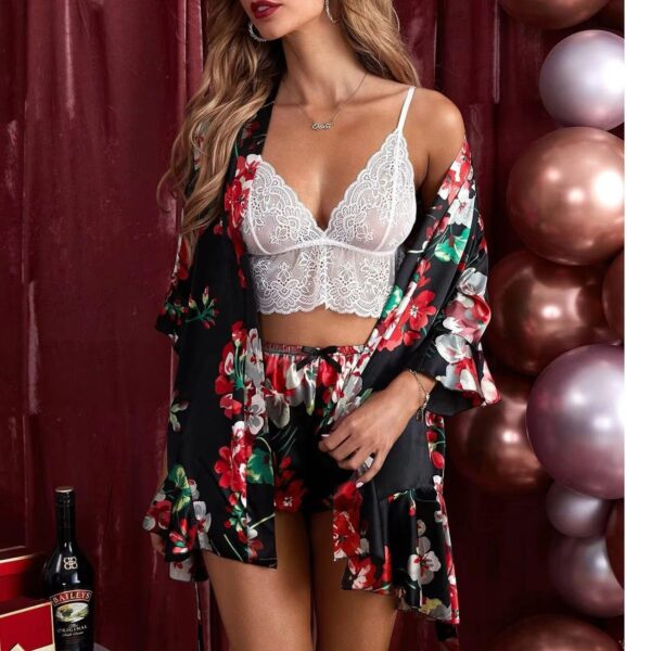 pijama de satén. short, bata y top de encaje